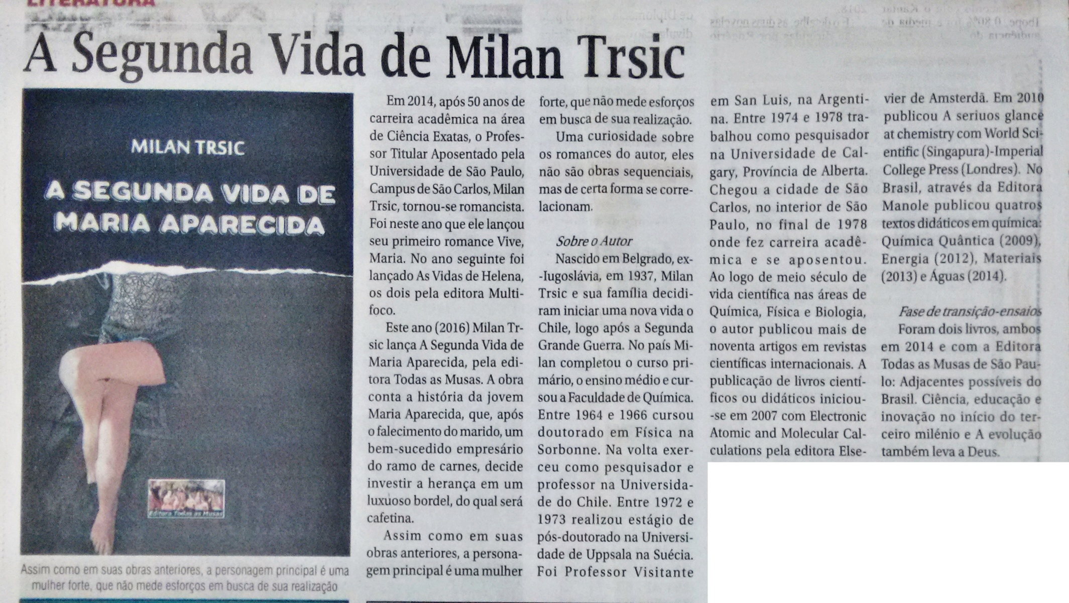 Em 2014, após 50 anos de carreira acadêmica na área de Ciências Exatas, o professor Titular Aposentado do Instituto de Química de São Carlos (IQSC) da Universidade de São Paulo (USP), Milan Trsic, tornou-se romancista. Foi neste ano que ele lançou seu primeiro romance "Vive, Maria". No ano seguinte foi lançado "As Vidas de Helena".