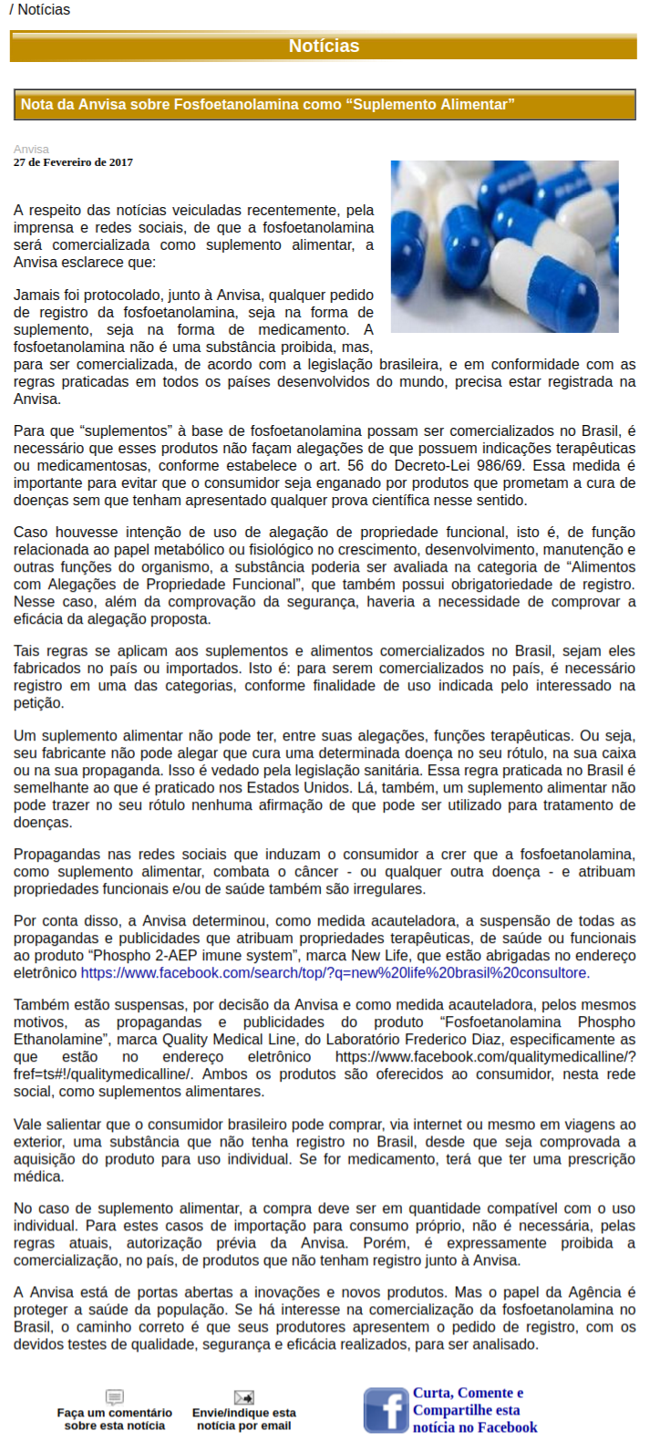 Nota da Anvisa sobre Fosfoetanolamina como “Suplemento Alimentar”