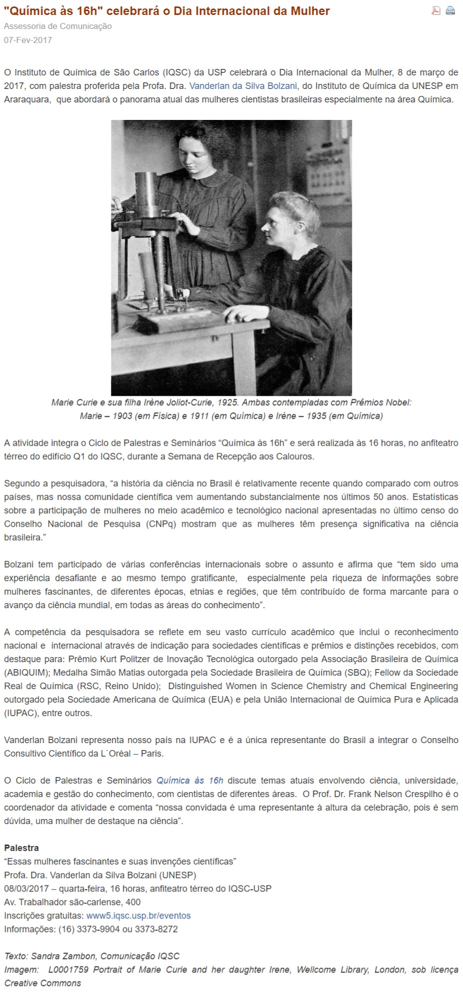 | dc.description.abstract | O Instituto de Química de São Carlos (IQSC) da USP celebrará o Dia Internacional da Mulher, com palestra proferida pela Profa. Dra. Vanderlan da Silva Bolzani, do Instituto de Química da UNESP em Araraquara, que abordará o panorama atual das mulheres cientistas brasileiras especialmente na área Química. | pt_BR |