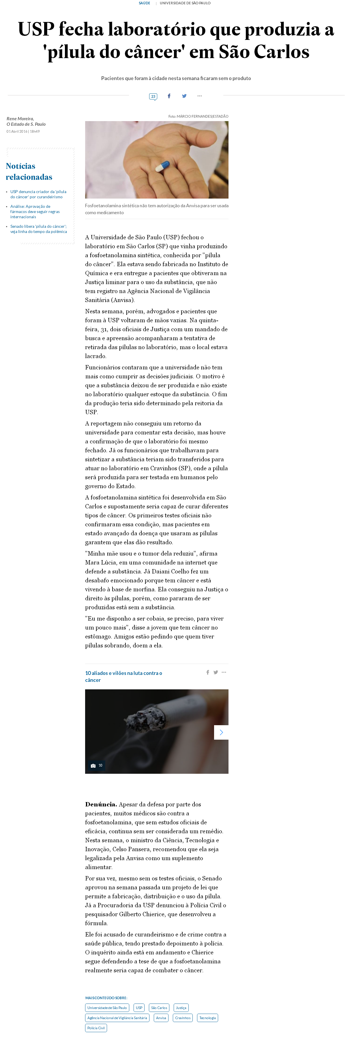 A Universidade de São Paulo (USP) fechou o laboratório em São Carlos (SP) que vinha produzindo a fosfoetanolamina sintética, conhecida por "pílula do câncer".