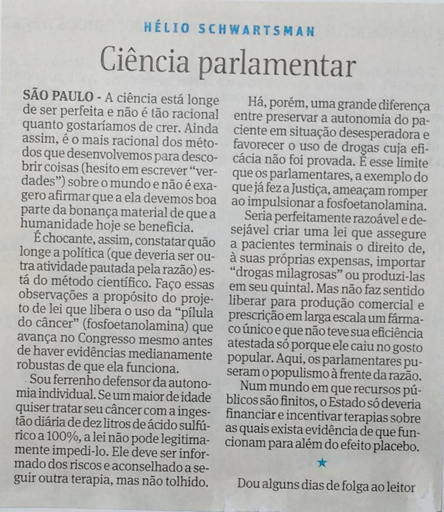 Schwartsman escreve sobre a fosfoetanolamina, e defende que os parlamentares sejam imparciais nas votações.