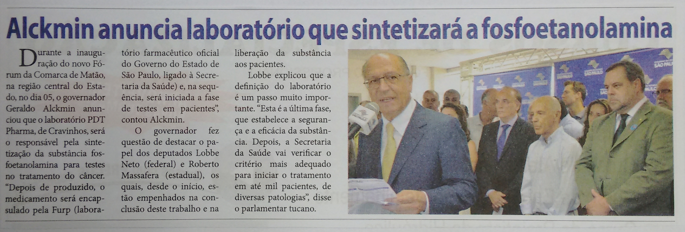 Durante a inauguração do novo Fórum da Comarca de Matão, na região central do estado, o governador Geraldo Alckmin anunciou que o laboratório PDT Pharma, de Cravinhos, será responsável pela síntese da fosfoetanolamina.